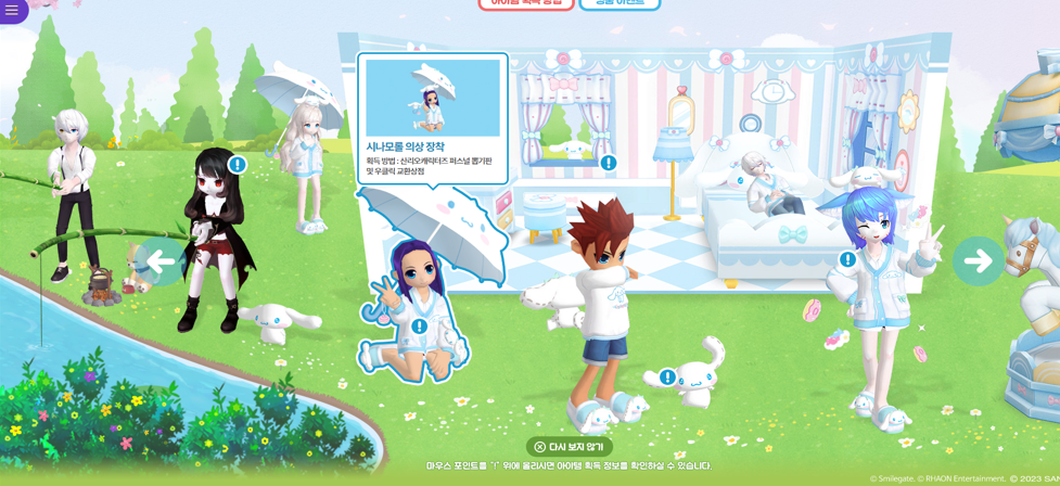 테일즈런너 x 산리오의 콜라보 홈페이지를 들어가보면 이렇게 다양한 산리오캐릭터 아이템들을 장착한 테런의 캐릭터들을 만나볼 수 있습니다. 추억의 초원과 리나 등 다양한 캐릭터들이 보이는데요. 해당 캐릭터의 아이템위에 마우스를 올려보면, 아이템을 획득할 수 있는 방법이 나온답니다.
