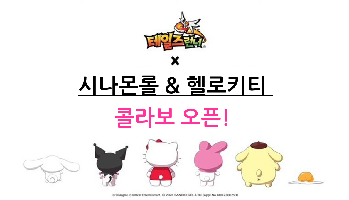 추억의 게임 테일즈런너가 산리오캐릭터들과 콜라보를 한다는 소식이 공개된 후 뜨거운 관심이 쏟아졌었습니다. 드디어 오늘 5/17 테일즈런너와 산리오의 콜라보 중 첫번째인 헬로키티와 시나몬롤이 공개되었습니다. 시나몬롤과 헬로키티 아이템 획득 방법과 경품이벤트는 테일즈런너 홈페이지에 자세히 나와있습니다. 아래에서 자세하게 알아보도록 하겠습니다.